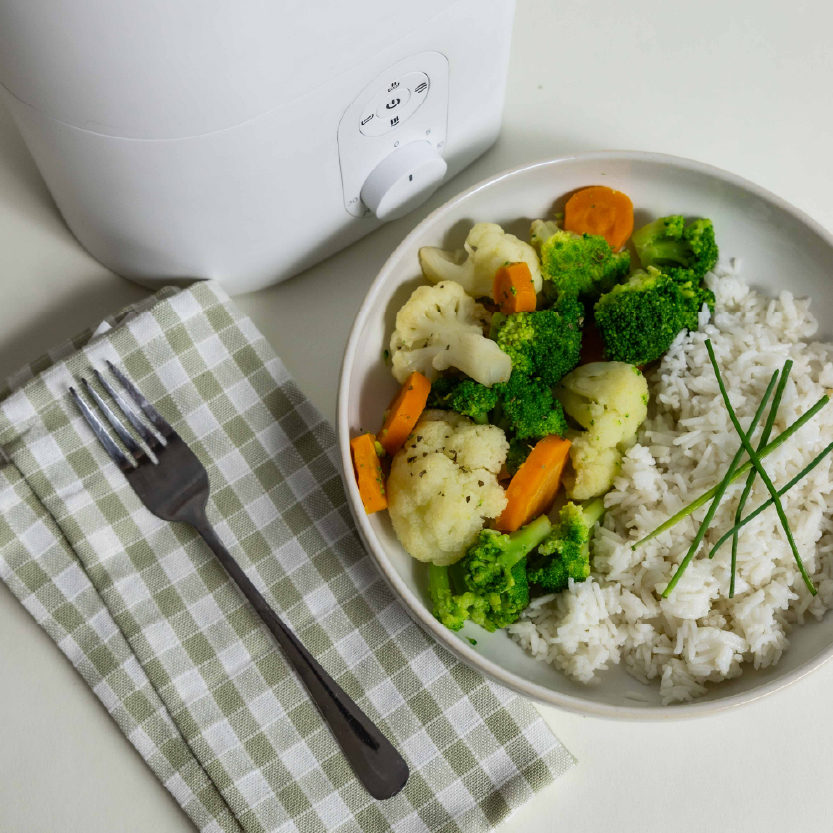 Vaporcrem es un robot de cocina compacto y fácil de usar, diseñado para que comer sano no dependa del tiempo que tengas. Solo añade los ingredientes, pulsa un botón y en minutos tendrás una crema de verduras caliente o verduras al vapor, listas para servir.